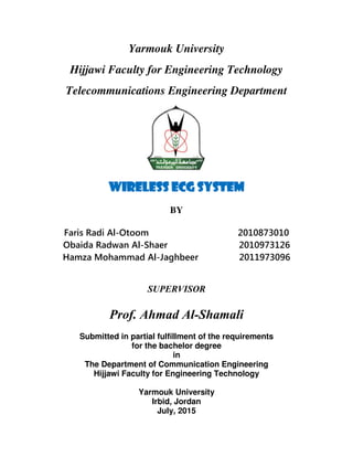 MSP430 and on the on-chip ZigBee wireless network. This design can be used in both home healthcare and sports training settings. System Description The designed ECG monitoring system is generally composed of two partsโthe monitor terminal and the central controller. The wireless monitor terminal would be worn by the monitored person. Wireless ECG monitoring system consists of 5 blocks, signal input, signal conditioning, signal processing, wireless communication using G SM/GPRS and computer software using embedded C language.